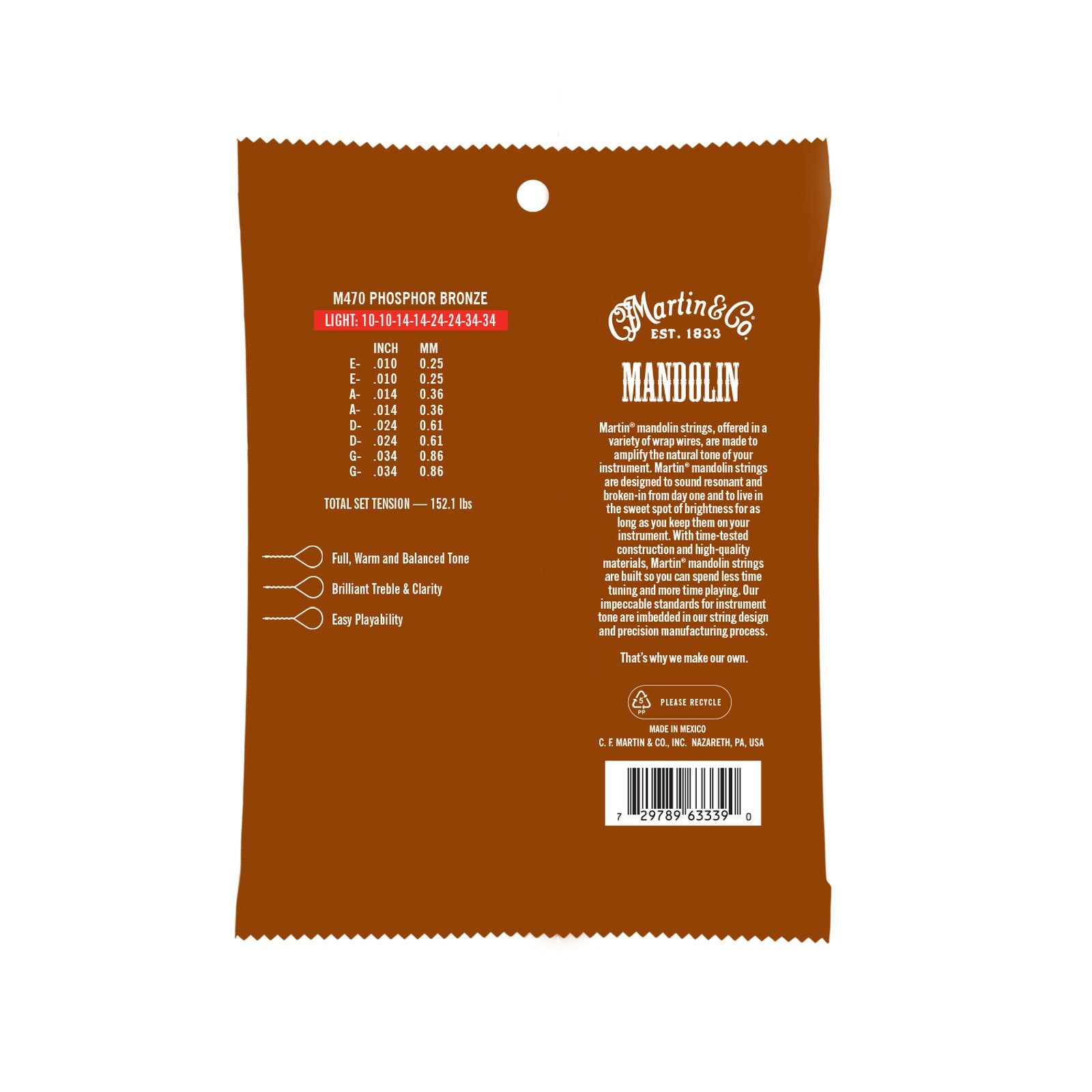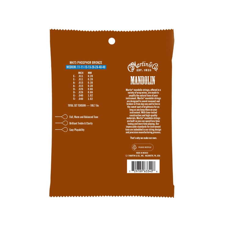 Martin’s M470 (Light) and M475 (Medium) mandolin strings are engineered with a high-tensile tin-plated steel core and wrapped in premium phosphor bronze, offering superior tone stability and tuning consistency. These strings reduce the need for frequent tuning, so you can focus on what matters most—playing.